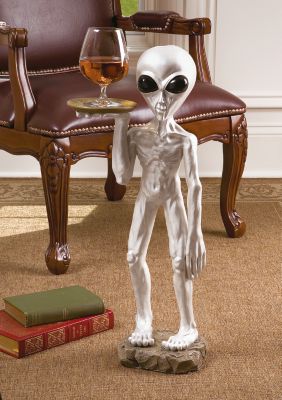 In this case let's say that Mark the catalog guy has to catalog this new arrival: Roswell, the Alien Butler Sculpture. What does he think of? "I'm going to present it as the new home decor item for the leading men, so that once he's home from the multinational law office he directs, he can enjoy his Curvoisier sitting by the fireplace". Bad work, Mark the catalog guy!